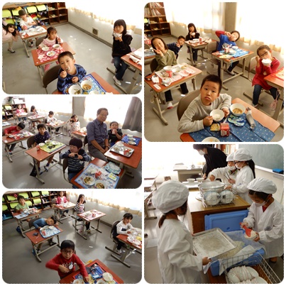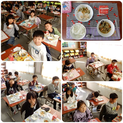1〜3年生の給食の様子です。今日の献立は、八宝菜、えびシューマイ、茎わかめのあえもの、ごはん、牛乳でした。