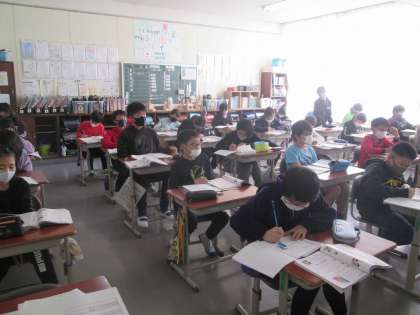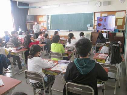 1組は体育の表現発表、2組は算数、3組は英語で動画を見ながら歌を歌っています。