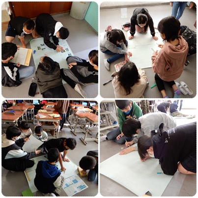 修学旅行新聞 公開日 2020/11/12 更新日 2020/11/12 水南HP 6年生の総合的な学習の時間です。修学旅行の班別に、研修してきたことをまとめて、模造紙に写真を貼ったり、文を書いたりしていました。来週の個人懇談のときには廊下に掲示します。 いいね(0)