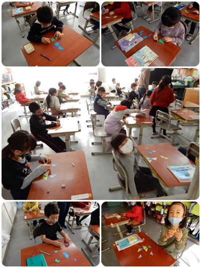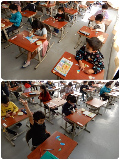 1年生の算数です。色板を使っていろいろな形が構成されていることを理解し、いろいろな形をつくる学習です。先生が作ったとおりにヨットを作っていました。