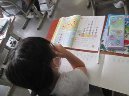 1年の算数です。棒グラフのように並べることによって見えてくることがあります。データを扱う第1歩です。