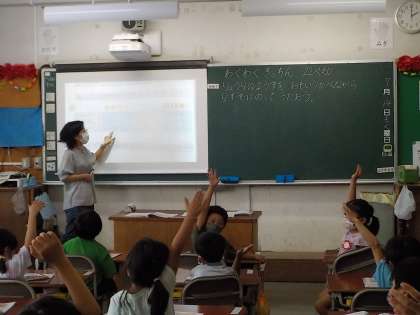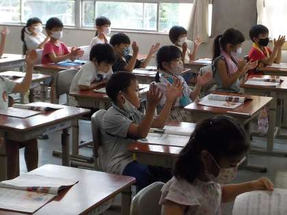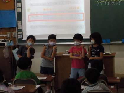 「たん」「たた」のリズム打ちを練習したあと、歌詞に合わせて振付を考え、披露!