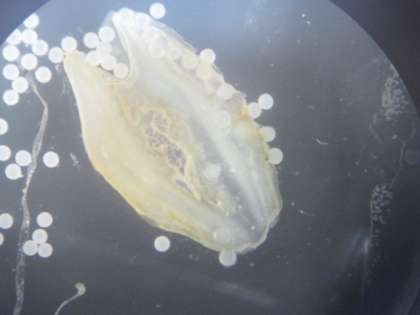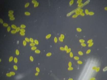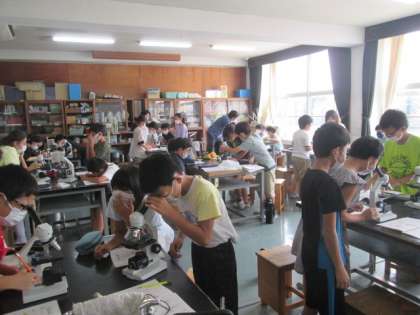 5年の理科でヘチマと朝顔の花粉を顕微鏡で観察していました。下2つの写真は上がヘチマで下が朝顔の花粉。各班で見やすい倍率にしていました。実際はどちらが大きいんでしょうか?