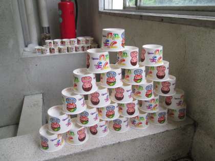 2年生の手洗い場に、先日給食で出たゼリーのカップが。何に変身するのかな?