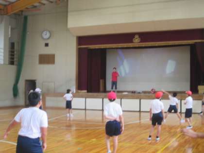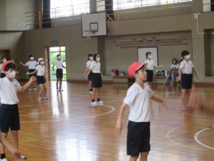 1時間目の6年の体育です。5年と動きが異なるところの練習です。朝の打合せが活かされる場面です。
