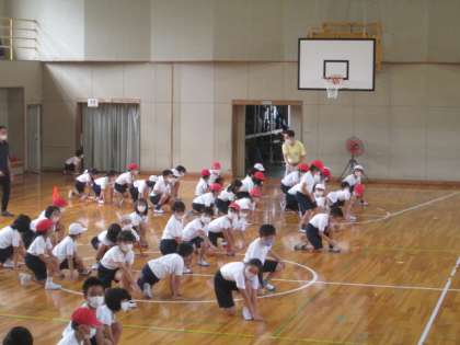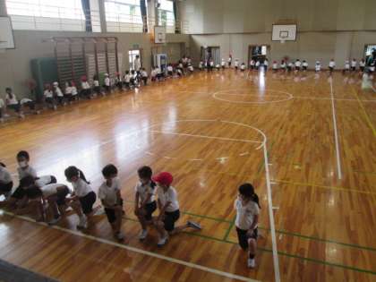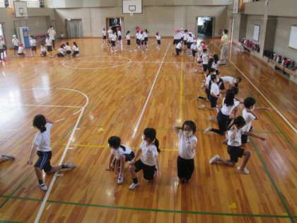 3年の合同体育です。隊形移動の確認後、実際に動いてみました。外との感覚はずいぶん違うでしょうが、大体の流れをつかんでいました。