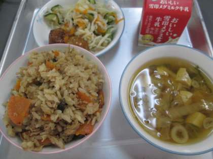 今日の給食は、ツナの炊き込みご飯、牛乳、ジャガイモののっぺい汁、牛蒡入りつくね、切り干し大根の甘酢和えでした。