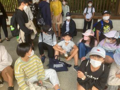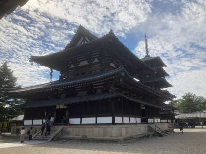 金堂の薬師如来坐像のアルカイックスマイルをまねてからの見学です。