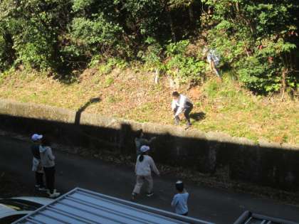 廊下から北にある斜面を見ていたら、ガサゴソ音がします。わかば組の探検隊でした。