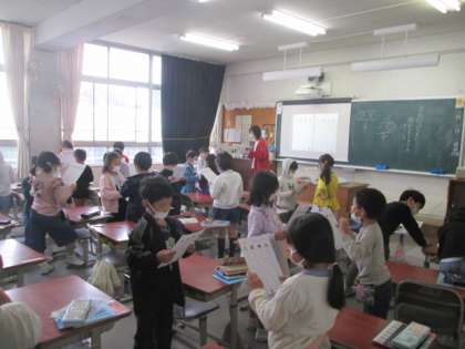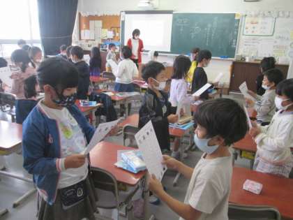 1年の算数は、繰り上がりのあるたし算の練習です。表に式があり、裏に答えがある紙を配布します。式を見て答えを言う子と、裏にある答えを見て、あっているかどうかを確かめる子のペアで練習します。繰り上がりや繰り下がりの計算は反射的にできるようになってほしいので、計算の仕組みを理解したら、ひたすら練習あるのみです。