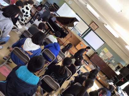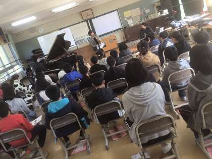 昼の休み時間には体育館でミニコンサートがあり、聴きたい子が集まりました。子どもたちは手足や体でリズムをとりながら、聴き入っていました。短い時間でしたが、プロの素敵な音色と、一体感に包まれた貴重な体験になりました。