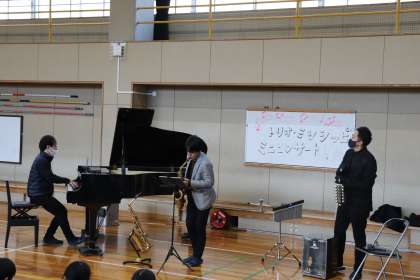 サクソフォン、ピアノ、パーカッションのアンサンブルグループ「トリオ・ミシシッピ」の皆さんが5年生の音楽に授業に入ってくださり、楽器の紹介や演奏を披露してくださいました。素晴らしい演奏の後、1・2学期に児童が演奏した「星笛」「茶色の小びん」をプロの方々とセッションできたことに、子どもたちは感動していました。