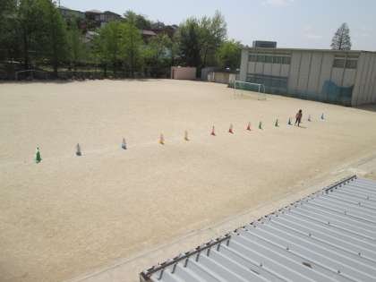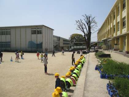 上の写真は、お迎え当番を待つ1年生です。下は、一斉下校が短時間で済むよう通学団ごとにコーンを置いているところです。