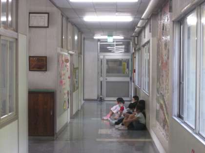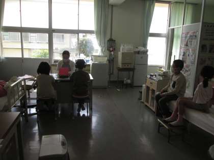 静かに廊下で待つ3年生。ヘッドホンをつけ、聴力検査です。