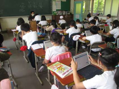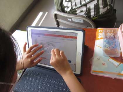 角度を測る練習問題です。タブレットに分度器を当てて測定し、答えを記入するんですね。