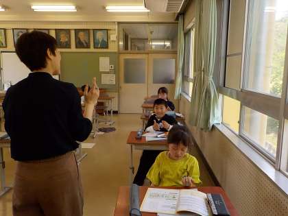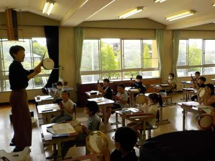 クラベス、タンブリン、カスタネットのグループに分かれて、先生のリズムをまねっこする3年生。いろんなリズムを上手に真似て演奏します。元気よく演奏したり、小さな音で優しく演奏したり。先生のリズムをしっかり聴いているから演奏できるんですよね。