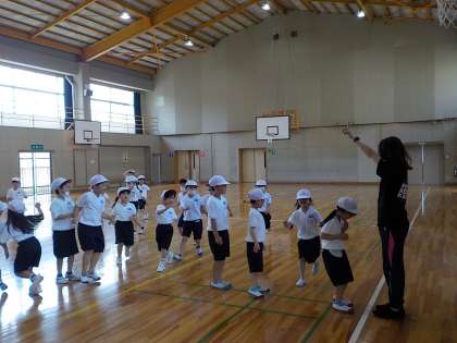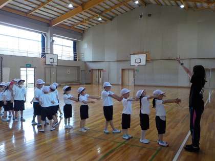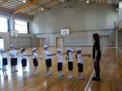 先生の指をよーく見て整列です。指を1本は一列に、2本は二列になります。集まったら、「前へならえ!」美しく整列できるようになりました。