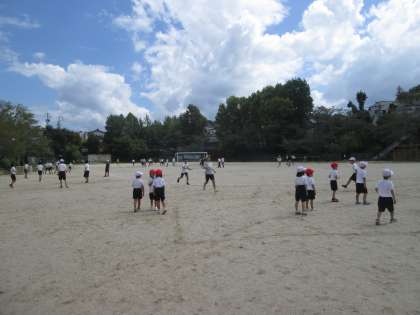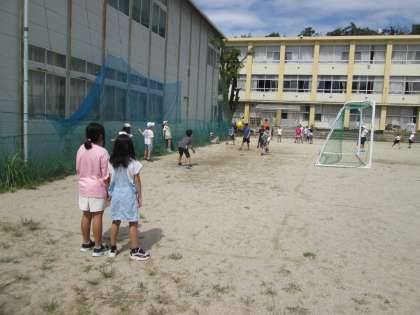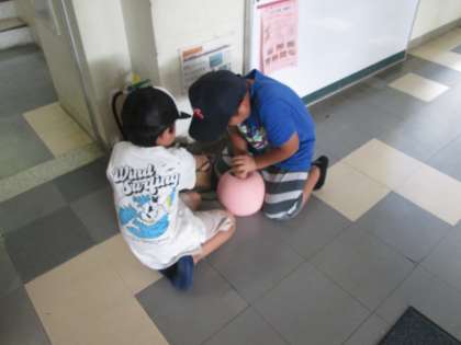 ドッジボールが大好きな子どもたち。ボールに空気を入れ、一目散に運動場へ。