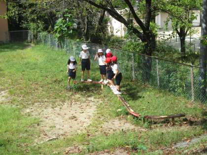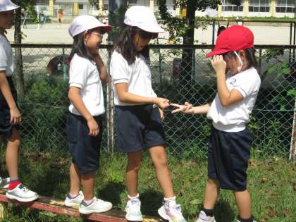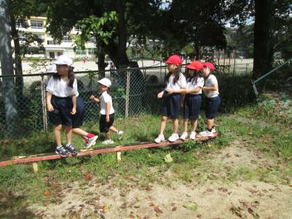 1年女子の遊び場は、さくら公園のS字の平均台。どの世代も遊んだのでは? 「最初は、グー」がたくさん聞こえてきていました。