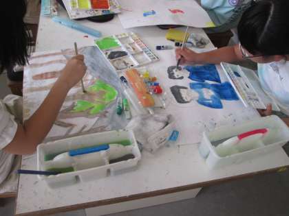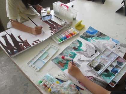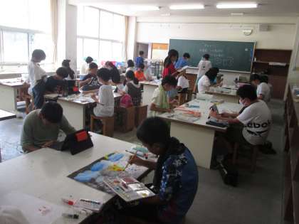 5年は「雪わたり」の感想画を描いています。図工室にはエアコンがないため、汗を拭きながらの活動です。