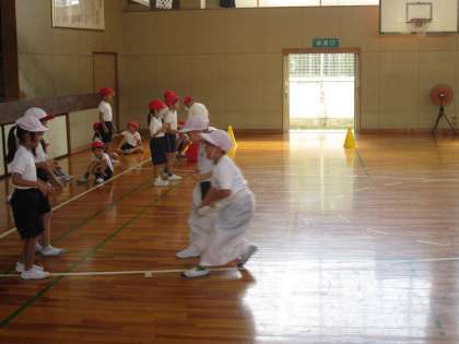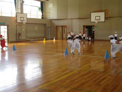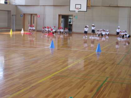 1年生が合同ででかパンの競争を体育館で行っていました。体育館で学年の競技が見られる方が表情豊かな場面がよく分かり保護者は喜ぶのかなと思っちゃいました。