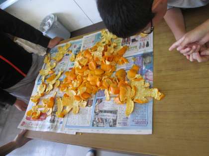 今日の給食に冷凍ミカンが出ました。その皮を集めて何かを作ります。さて、何を作るのでしょうか?