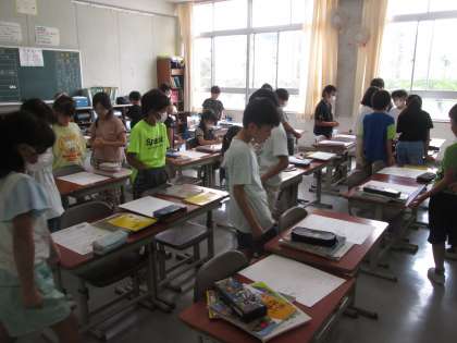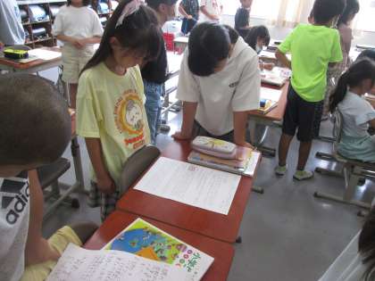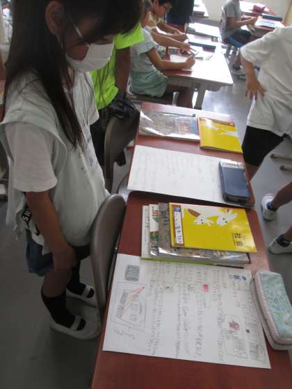 先日の校外学習のまとめを見あっている32組です。次のまとめに生かせるポイントが見つかったかな?