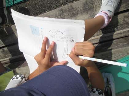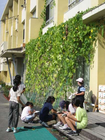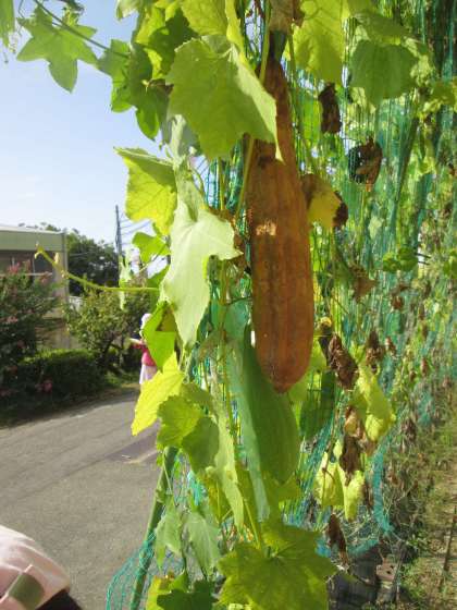 4年の理科はヘチマの観察。たくさんの実がなっていて、観察のしがいがあります。