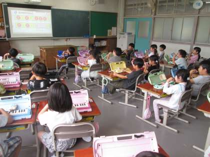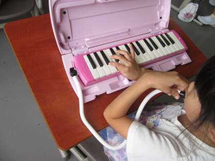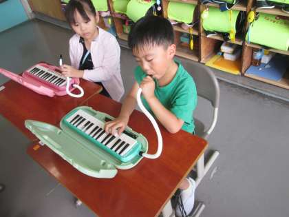 火曜日の5時間目が音楽の1年生。隣の子の音が、OKかどうかを教えてあげています。