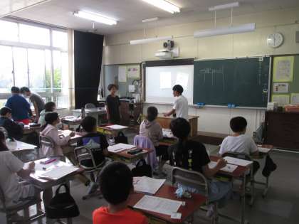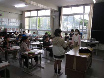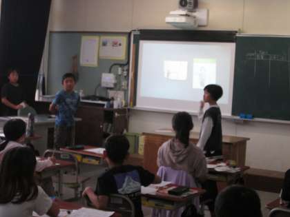 二人組で英会話を披露する5年生です。待っている間が一番集中して練習できたりして。