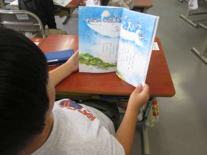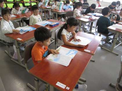 可愛らしい1年生の国語の挿絵。一生懸命、文字を追いながら音読する姿もいいですね。