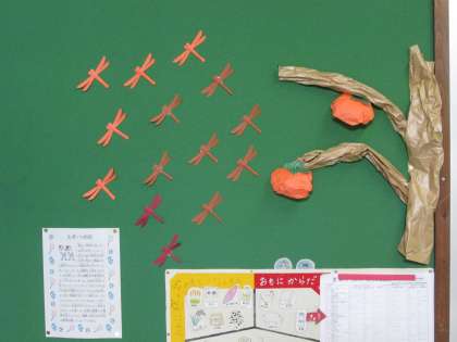 前回は、十五夜のお月見の様子。今回は、柿が熟し、赤とんぼの舞です。食欲の秋本番です。