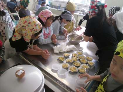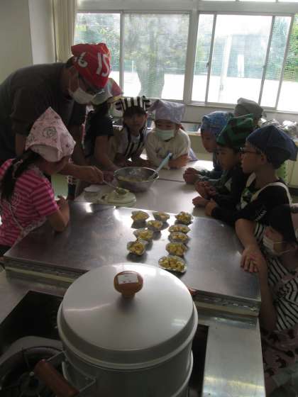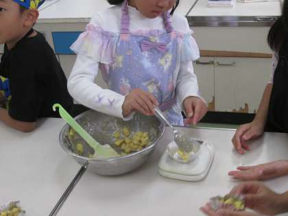 先月穫れたサツマイモをおいしくいただきます。今日は22組の鬼まんじゅう作り。おいしく出来たかな?