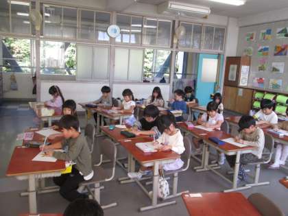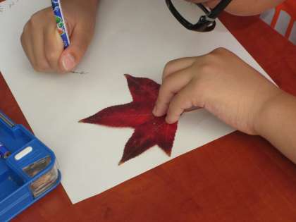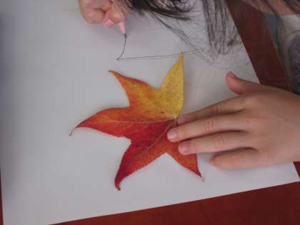 1年生が秋の葉っぱを描いています。25日(水)はマメナシ観察会の方々と市民公園に秋を探しに出かけます。きっといろんな葉っぱを見つけてくることでしょう。