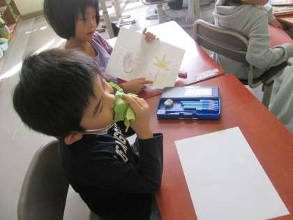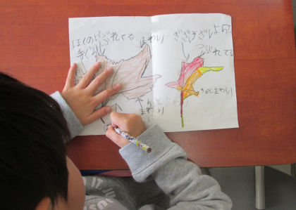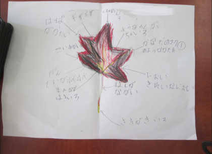 以前紹介した1年生の秋の葉っぱ。絵の完成とともに葉の特徴が書き込んであります。こんな表現ができるんだという驚きの文章も見られました。