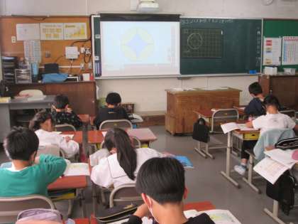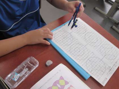 はじめてコンパスを使う3年生。今日はたくさんの円を描きながらきれいな模様作りです。