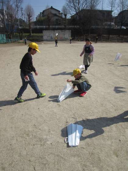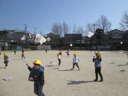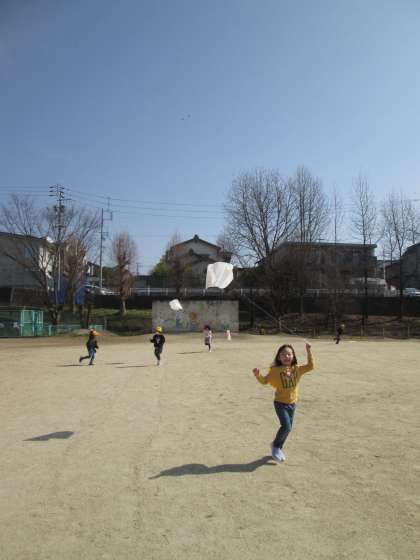 先日作った凧を揚げる1年生。疲れ知らずに走り回ります。時には糸が絡まることも。