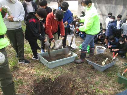 マメナシ記念植樹 1 公開日 2024/03/08 更新日 2024/03/08 水南HP 6年間取り組んできたマメナシ学習の最終日。自分たちで育ててきた苗を植えます。自分たちで作った堆肥も混ぜ込みます。 いいね(0)