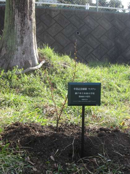 たっぷり水を注ぎ、最後は記念のプレートを地面に差し込みます。