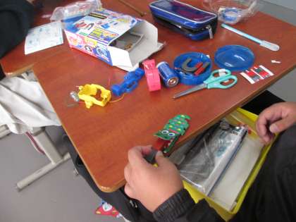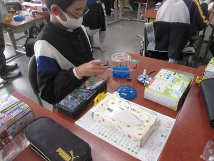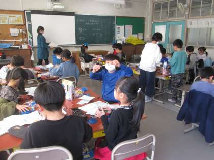 磁石の性質を使ったおもちゃ作りの3年生。磁石をいじっているといいアイデアが浮かびますよね。