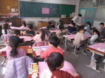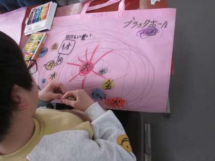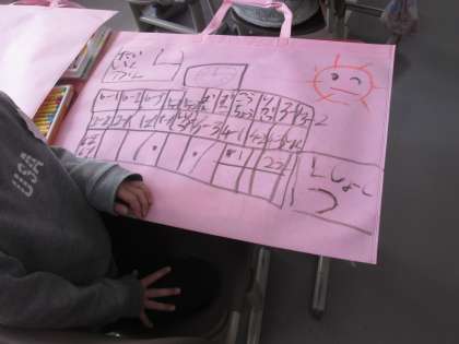 1年生が、図工の作品を入れるための鞄に絵を描いています。宇宙は詳しくて、ビックリ。学校の絵を描いている子が多くて嬉しいな。