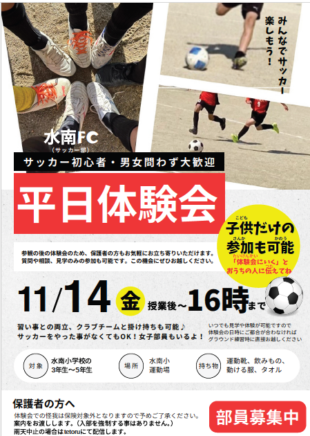 11/14(金)の授業参観後、3.4.5年生を対象にした体験会を行います。