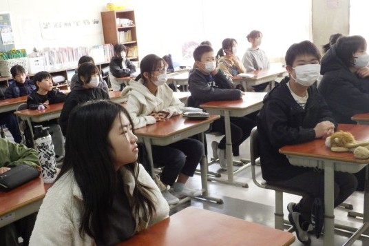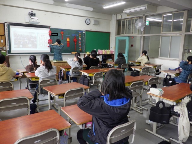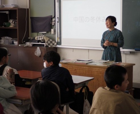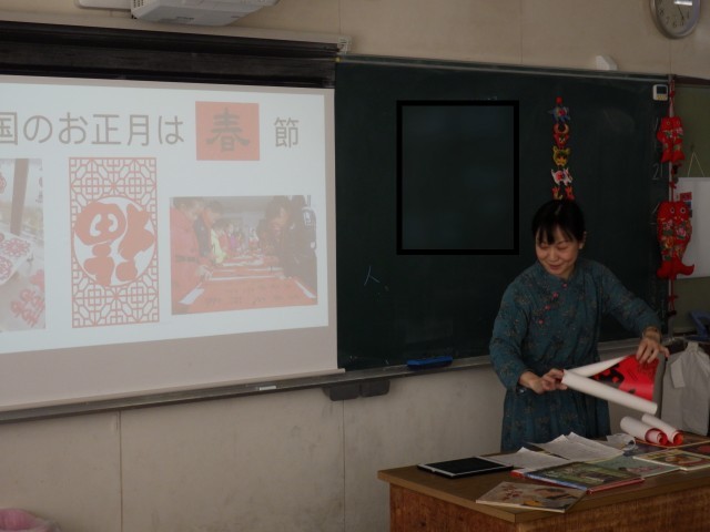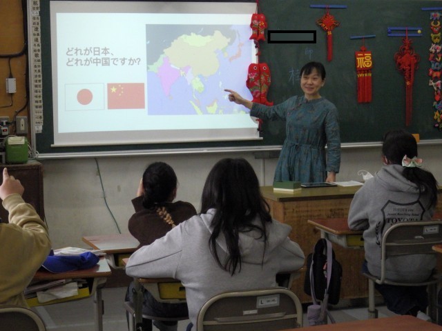 市のグローバル教育推進事業(国際理解)として、他国の様子を知る授業を行っていただきました。今回、話題としていただいたのは中国です。中国と日本との違い、特に食や遊び、同じ小学生の生活など、子どもたちにとって身近な話題をたくさんお話ししていただきました。子どもたちはとても興味津々な様子で、教えていただいた言葉を自然に復唱したり、中国の学校で行われているというツボ押しを一緒に行ったりしました。最後には、講師の先生と一緒に写真を撮る学級もありました。こうした機会が他国と友好的に関わろうとするきっかけになるといいですね。