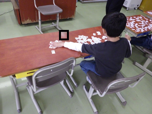 1組では、動物のイラストで名前を確認した後、その名前をひらがなが書かれたカードでつくる活動を行いました。イラストで確認したことで、名前の表記と結びつけて考えやすくなり、自身をもって取り組めたようでした。