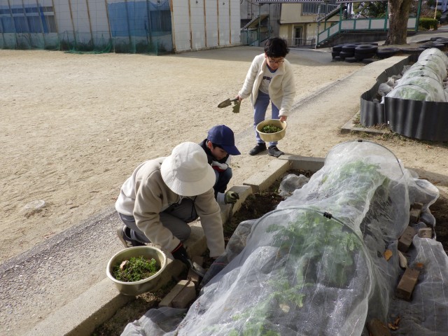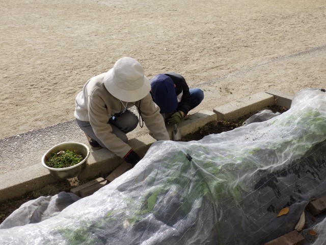 2組では、収穫待ち遠しいダイコンの畑で、草取りを行いました。しっかりと栄養が取れるようにと、一生懸命に取り組みました。