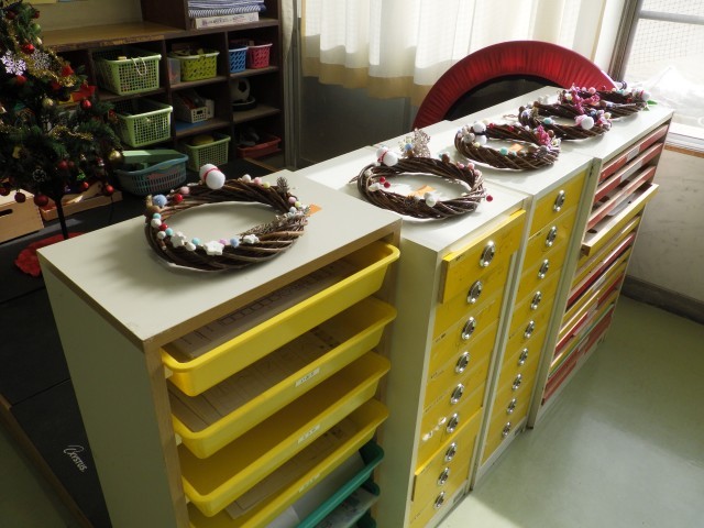 図工の授業で、リースやクリスマスツリーの飾り付けを行いました。それぞれの工夫が生かされ、華やかできれいなリースやツリーになりました。