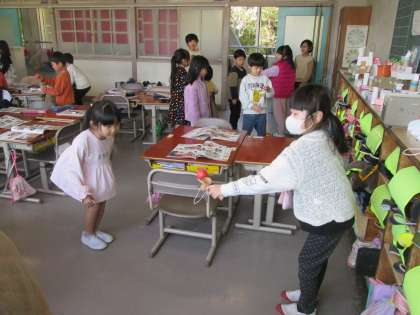 12組が昔遊びでけん玉に取り組んでいます。お皿に乗った時って、見てる方も嬉しいですよね。成功するたびにあちらこちらから拍手が聞こえました。