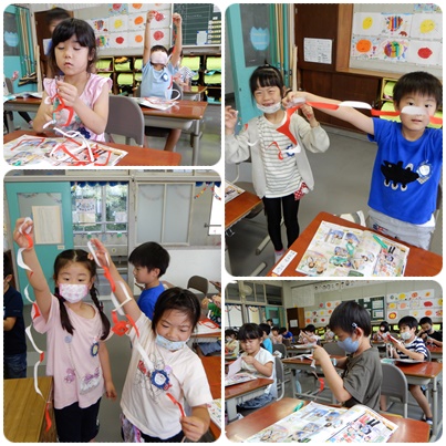 1年生の図工です。今日は素敵なつるす飾りをつくるためのウォーミングアップのようです。