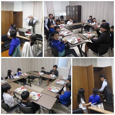 総務委員会(児童会)が主催した宝くじ企画がありました。宝くじの当たりくじの一つが「校長室で給食を食べる券」でした。見事に射止めた10名が校長室にやってきました。校長室には「秘密の扉」があります。この写真では写っていませんが、給食を食べるときにとても便利な扉なのです。何が隠されているでしょう・・・?