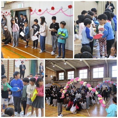 4月9日(木)、今日は、転任して来られた教職員の着任式、始業式、新1年生との対面式、の3つの式を連続で行いました。児童会が主催した対面式では、2年生から1年生に「去年育てたアサガオの種」をプレゼントしました。退場する時は、花のアーチをを作って1年生を送り出しました。
